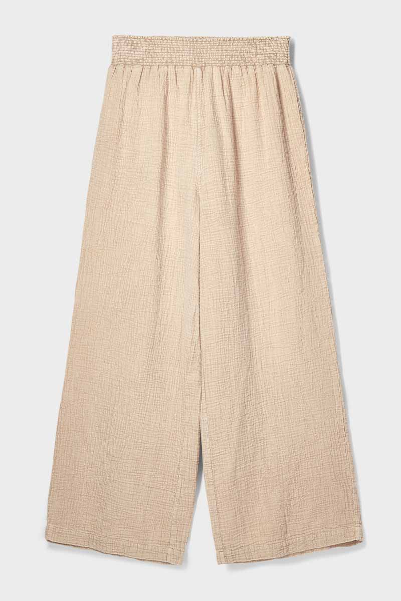 The Stephanie trousers are crafted from 100% breathable cotton. Featuring a soft crinkled texture, elasticated shirred waist. Wide leg fit.