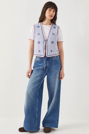 Our lightly quilted embroidered Teleri gilet. Placement floral embroidery on a printed stripe. Embroidery details on the tie with tonal tassel. Gilet is fully reversible.