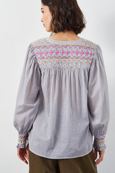 Our lightweight cotton voile stripe Alma top. Intricate embroidery and smocking detail on front and back yoke. Line stitch embroidery along front placket. Contrast colour stitch detaling with mother of pearl buttons. Lightly gathered shoulder detail. Matching smocking and embroidery detail on cuffs.