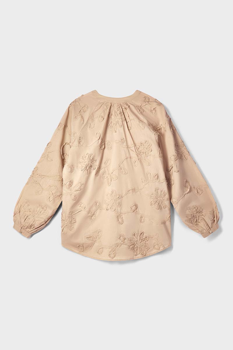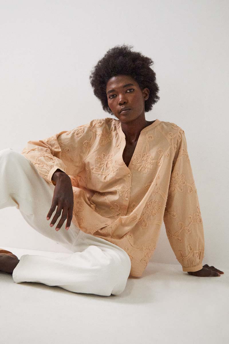Our Avari top is crafted from 100% cotton and embroidered in self fabric with a floral loop design featuring raw edge detailing for added texture, finished with mother-of-pearl buttons, a flattering notch neck, curved hem, raglan shoulders, and button-and-loop cuffs.