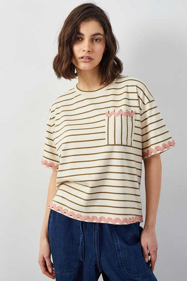 Our Ebba Jersey Striped T-shirt with contrast embroidery ric rac detail on sleeves, hem and front pocket. Boxy relaxed fit.