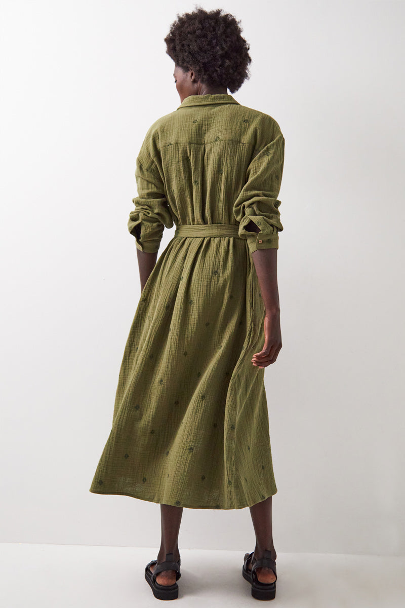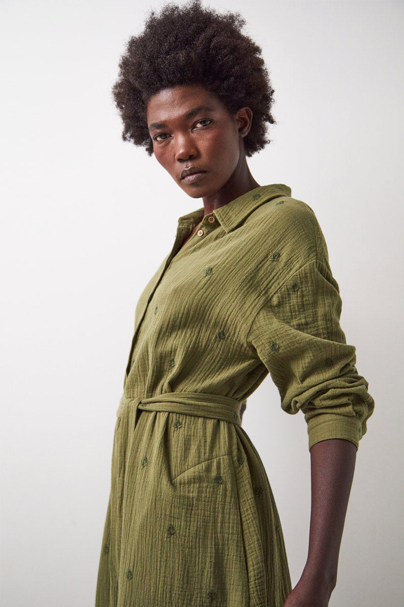 The Evaline Khaki dress crafted from cotton double gauze. Leaf embroidery all over the dress. Tie waist belt finished with tassels. Flattering midi length with button down placket. Two side pockets.