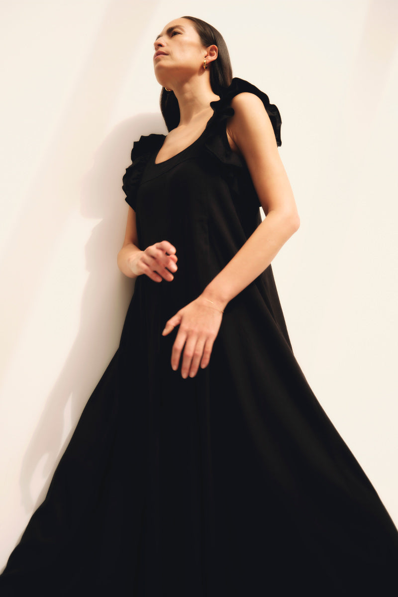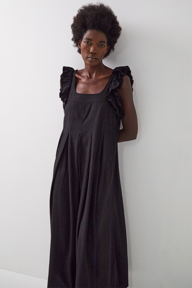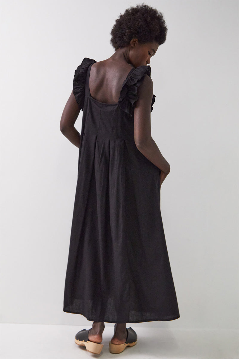 The Evie Dress is crafted from a breathable linen blend. A curved square neckline and statement ruffle sleeves add modern romance, while sewn-down pleats release into gentle volume through the midaxi-length skirt. Fully lined for a smooth silhouette.