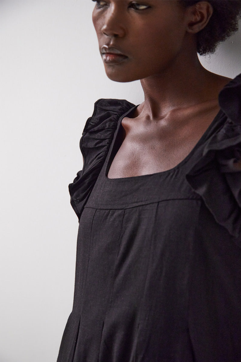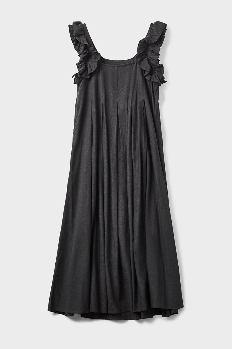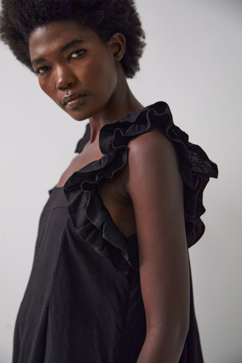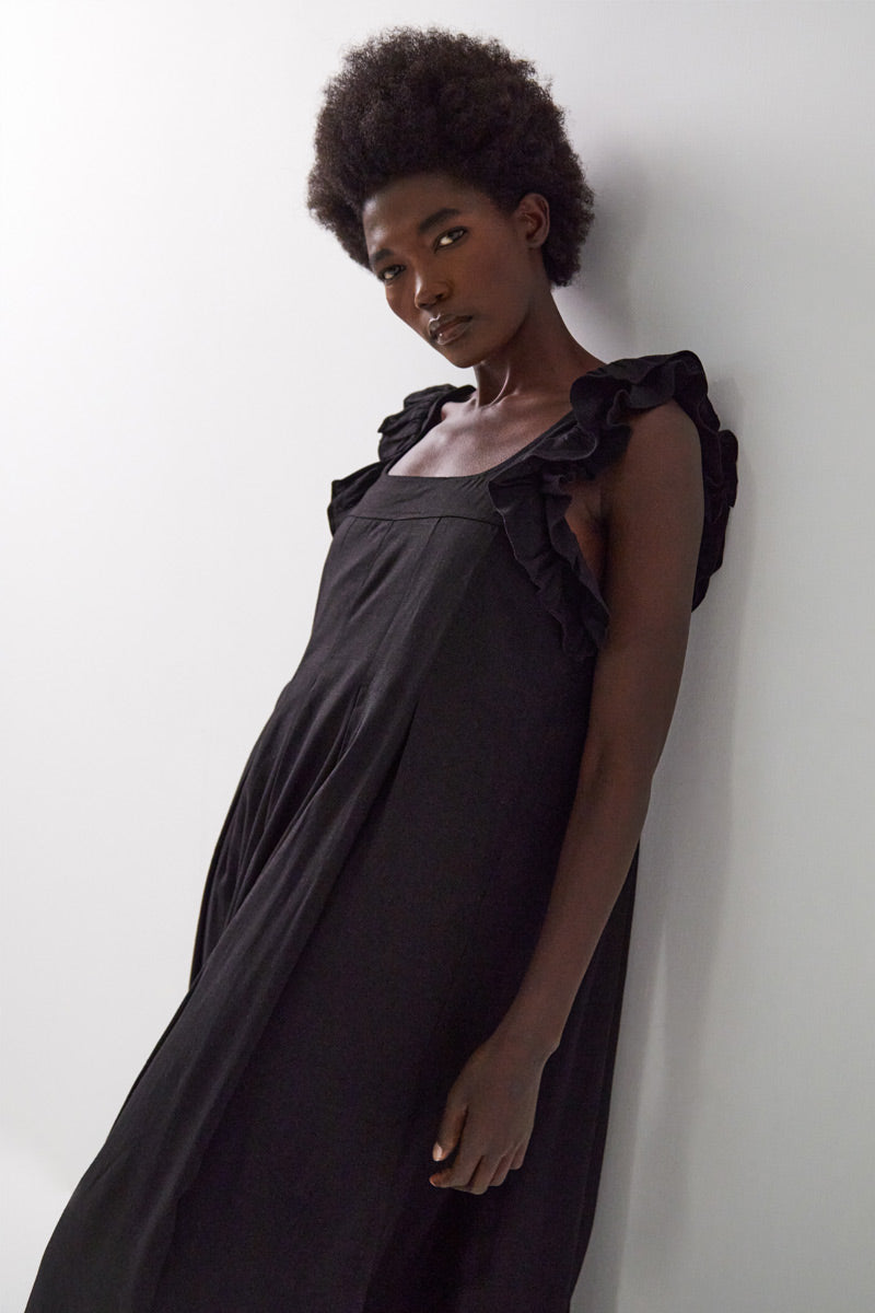 The Evie Dress is crafted from a breathable linen blend. A curved square neckline and statement ruffle sleeves add modern romance, while sewn-down pleats release into gentle volume through the midaxi-length skirt. Fully lined for a smooth silhouette.