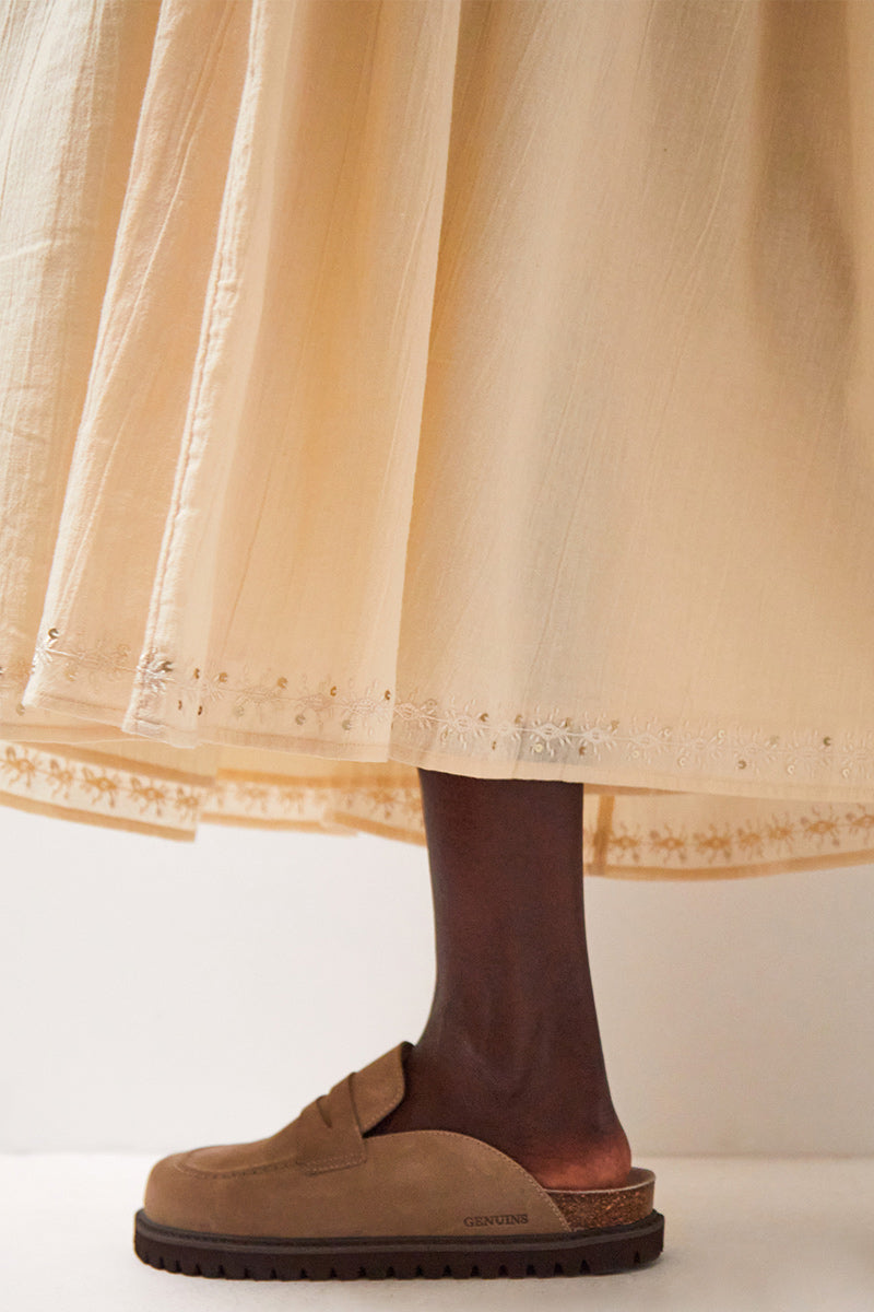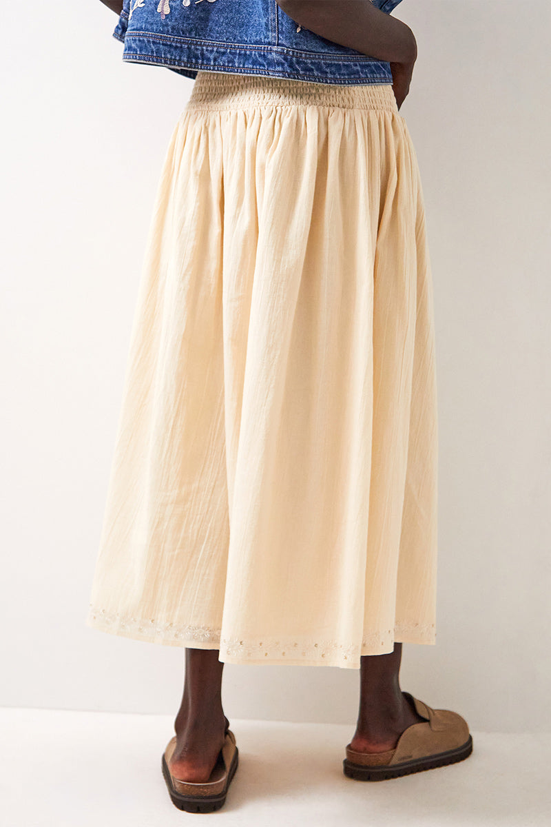 The Judy Skirt - crafted from soft, crinkle cotton. Delicate embroidery around the hem. Elasticated shirred waist. Flattering midi length. Skirt is fully lined.