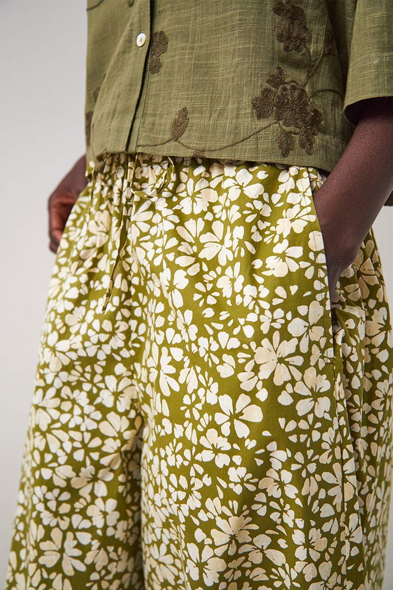 The Karlie Trousers crafted from Cotton. Wide leg fit. All over Ecru floral print on an Olive green base. Elasticated waist. Side pockets. Pair with the Karlie Top.