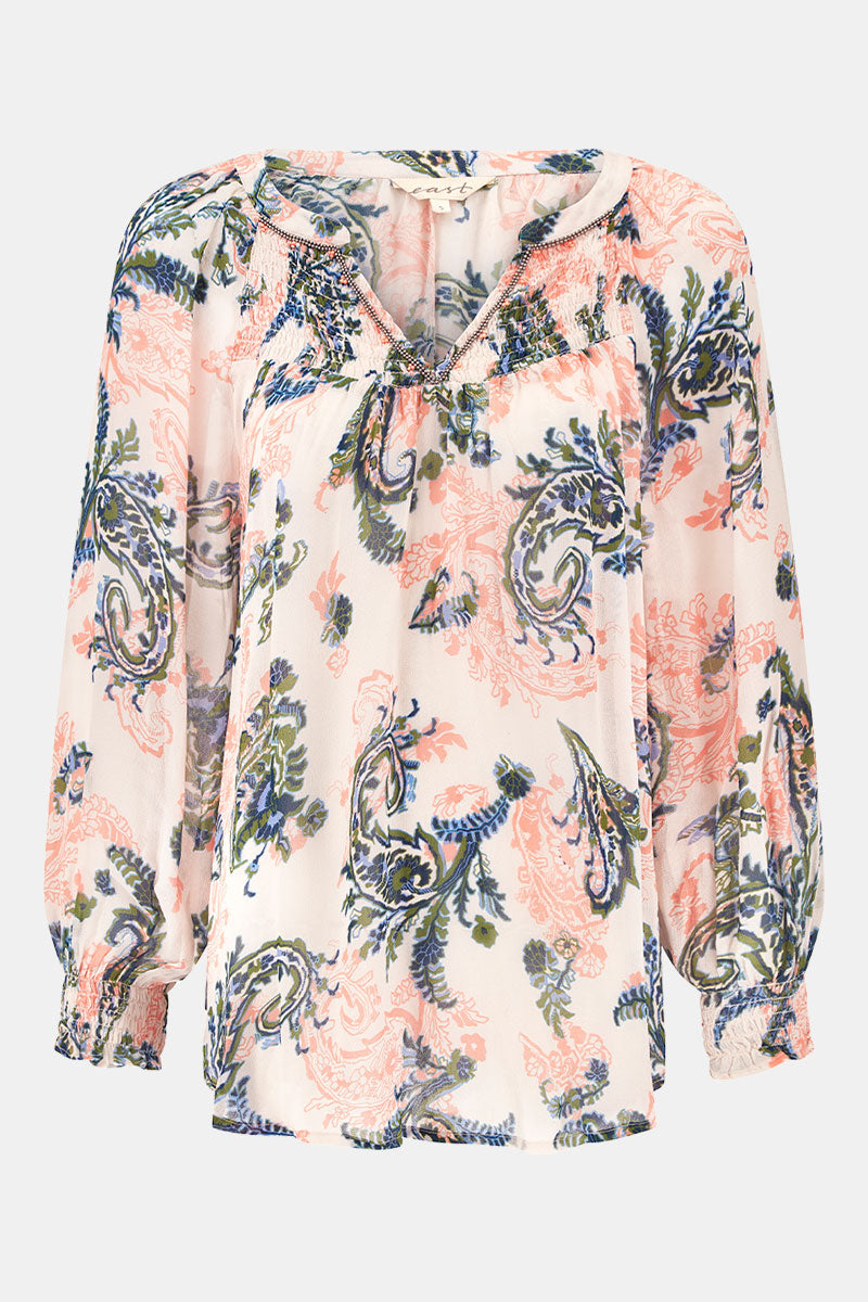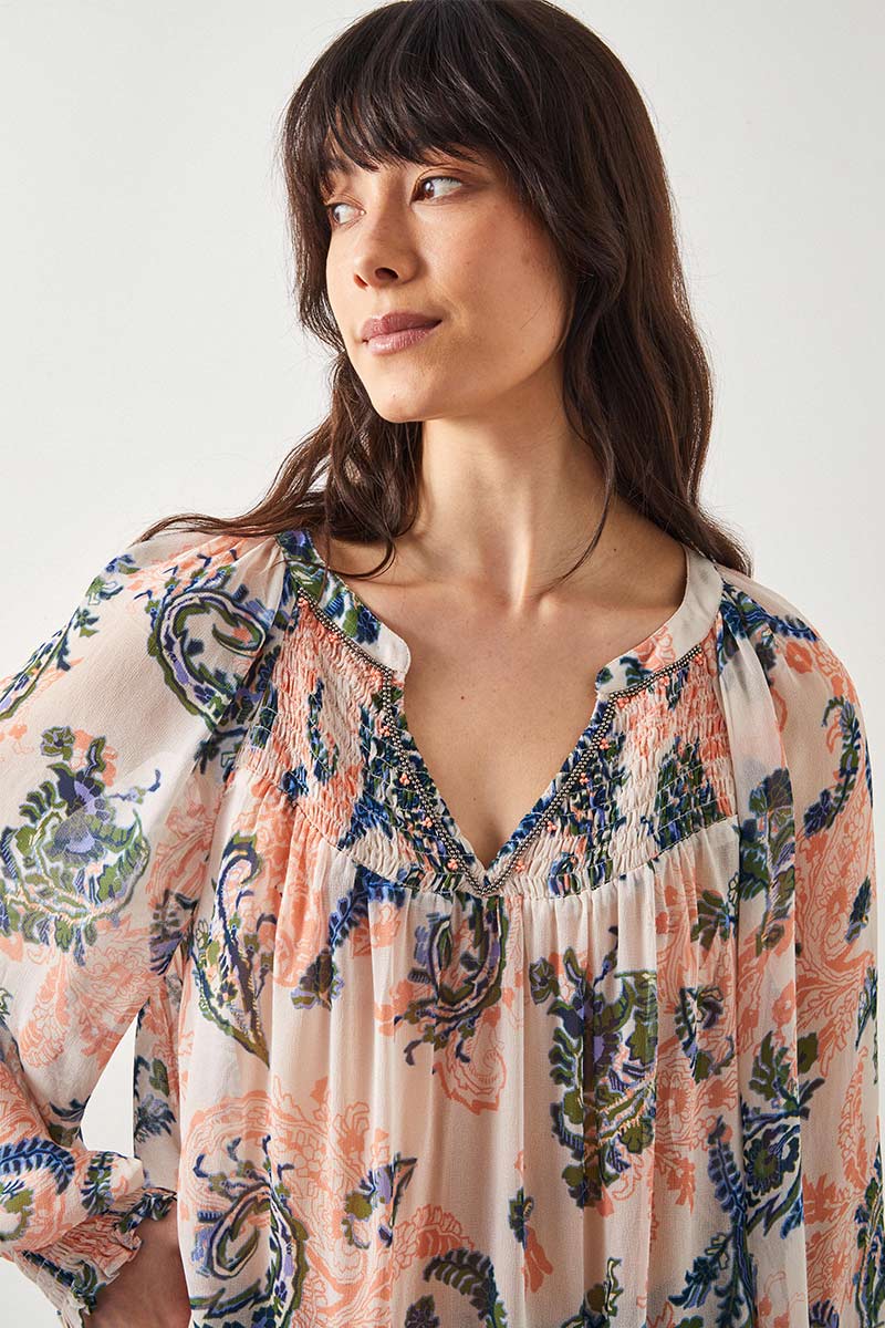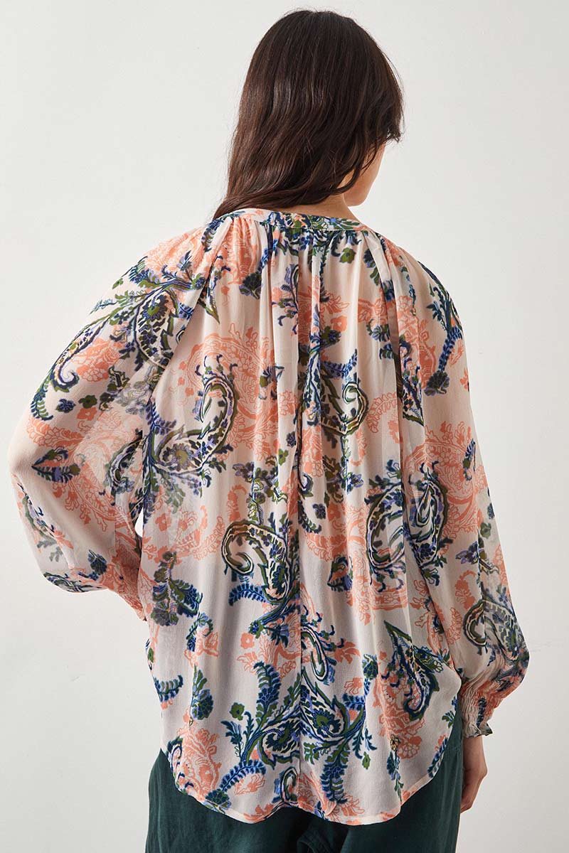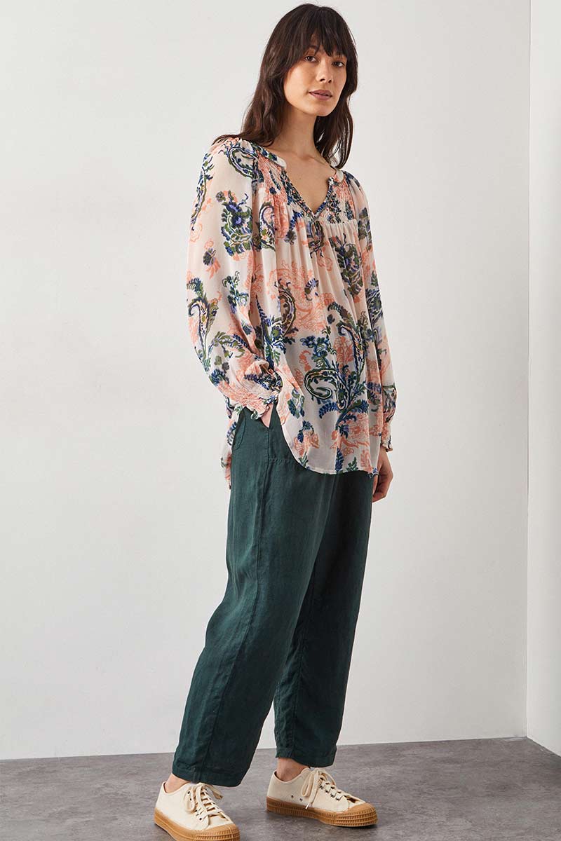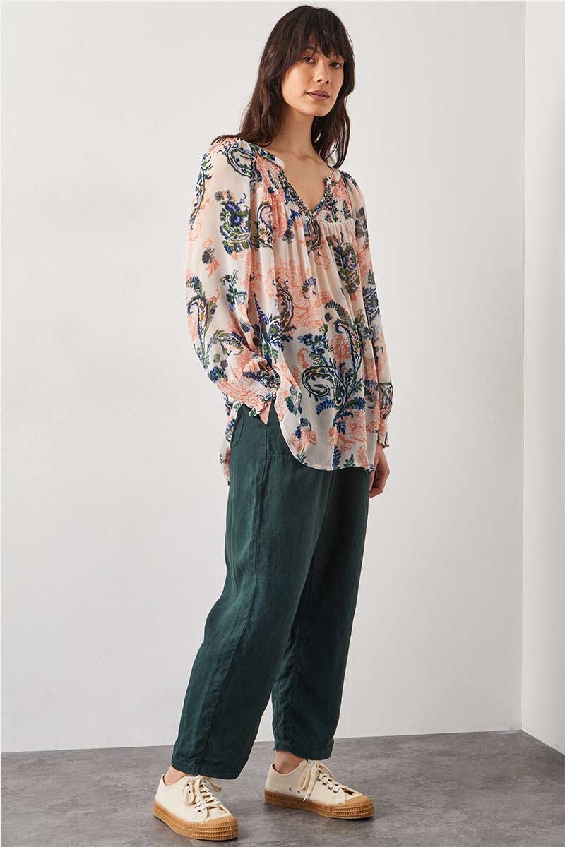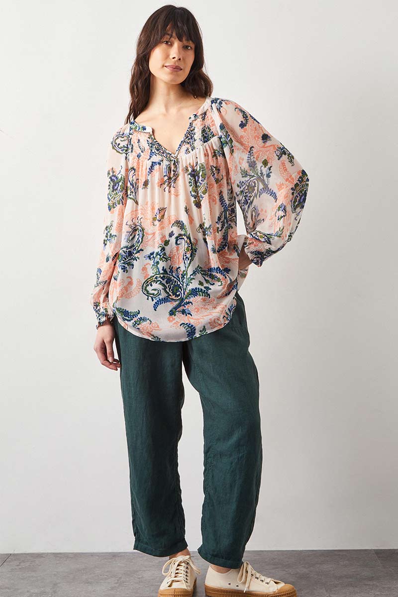 Made from 100% FSC Viscose Georgette, the Leilli Top is lightweight and easy to wear. With a delicate botanical motif print in natural green and blue hues over the gorgeous peach viscose georgette, this style is perfect for day and night.