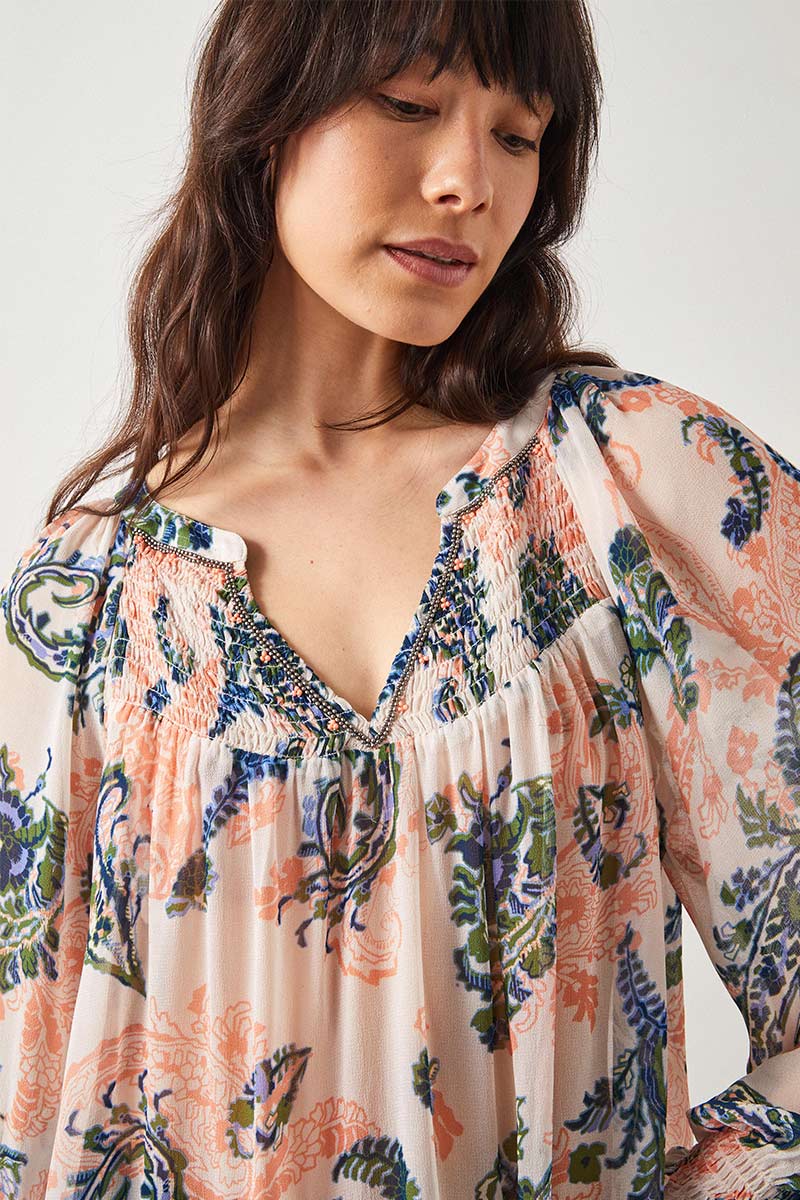 Featuring a loose silhouette, full length blouson sleeves with gently elasticated cuffs, with a shirred front bordering a notch neckline delicately beaded, the Leilli has high chances of becoming your new favourite blouse.