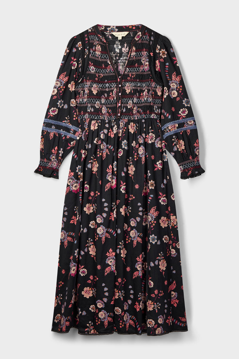 The Madison Dress, crafted from soft floral-printed cotton. It's fitted bodice features full smocking with striking contrast embroidery. Delicate lace inserts grace the shoulders, while gentle puff sleeves sit neatly in place, finished with elasticated cuffs. An easy V-neck opening finished with smoky mother-of-pearl buttons. Fully lined and falling to a flattering midi length.