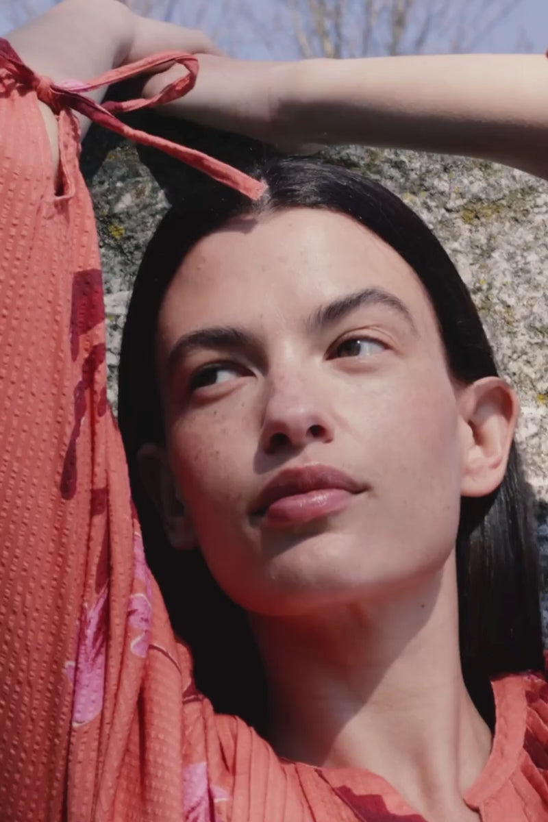 Hand-painted botanical print in a soft pink and maroon palette, set against a dusty clementine, cotton seersucker base. A relaxed, flowing fit with a V-neckline and three-quarter-length sleeves, and refined by neat pintucking down the front and back bodice and a gathered skirt panel for added flare. Finished with drawstring cuffs detailed with wooden bead tie ends, and delicate shell buttons down the centre-front placket. Midi length.