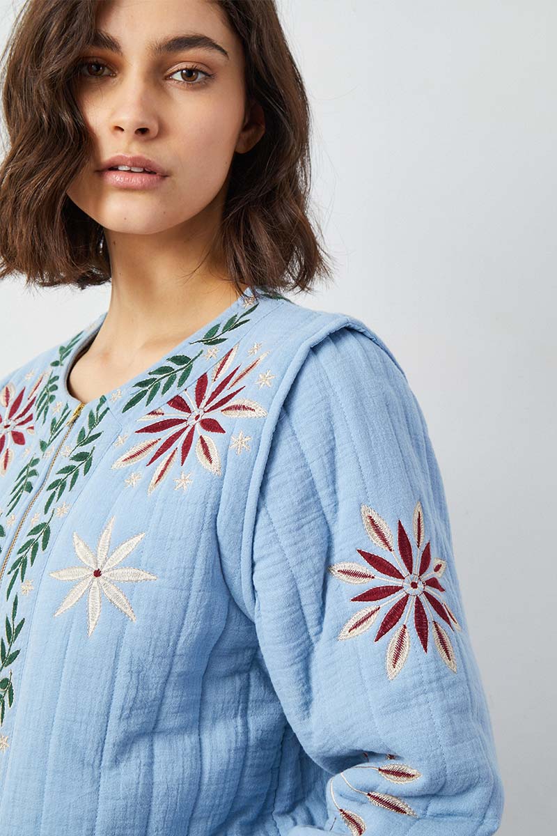 Our decorative machine embroidered Mererid jacket in a light-weight cotton voile. Delicate borders of metallic thread on embroidery details. Embroidered front pockets. Boxy fit. Fully lined.