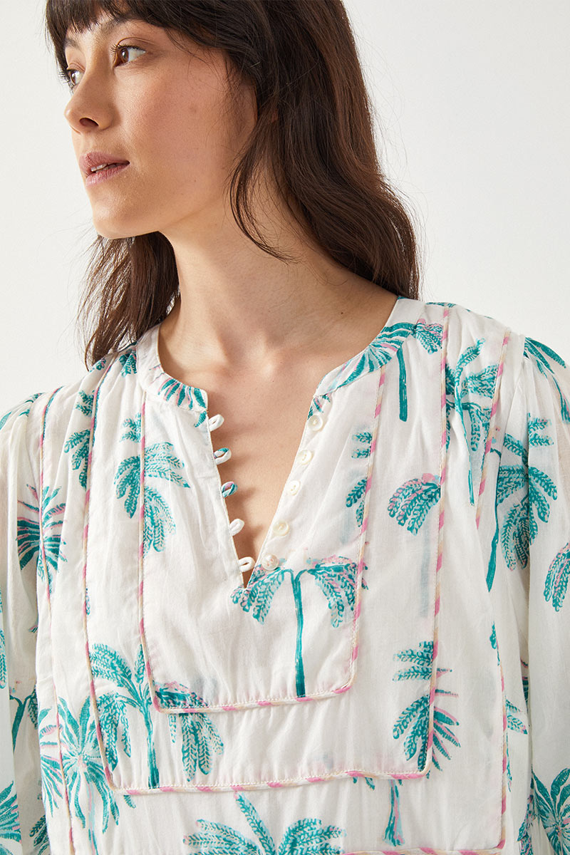 The Pammie Dress features a hand-screen-printed palm tree design on soft cotton voile fabric, crafted in a flattering midi length. Delicate contrast stripe piping forms a bib shape on the front, with soft gathered tiers throughout. Gentle gathers sit neatly on the shoulders The dress includes a removable slip.