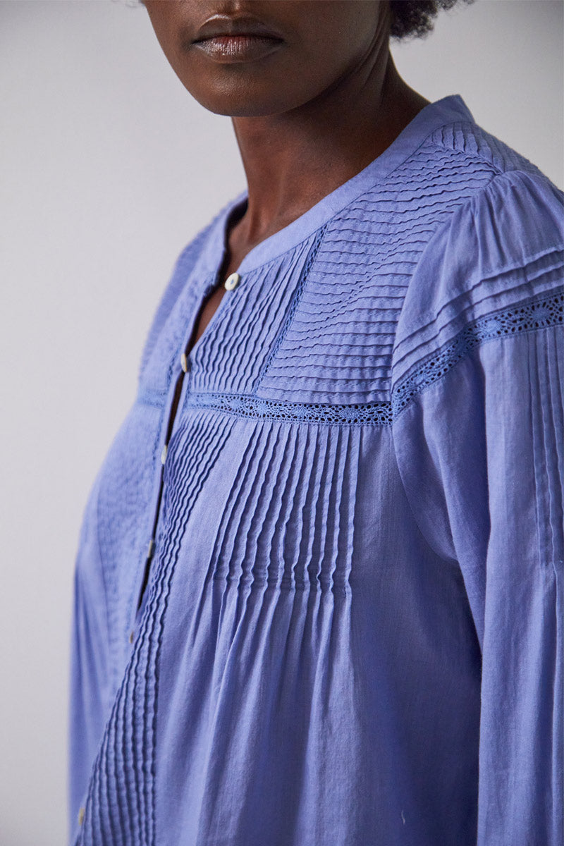 Crafted from 100% cotton, the Scarlet Top features intricate pintuck detailing and a relaxed, voluminous silhouette. Soft blue hue, gently gathered sleeves, and delicate button-down front.