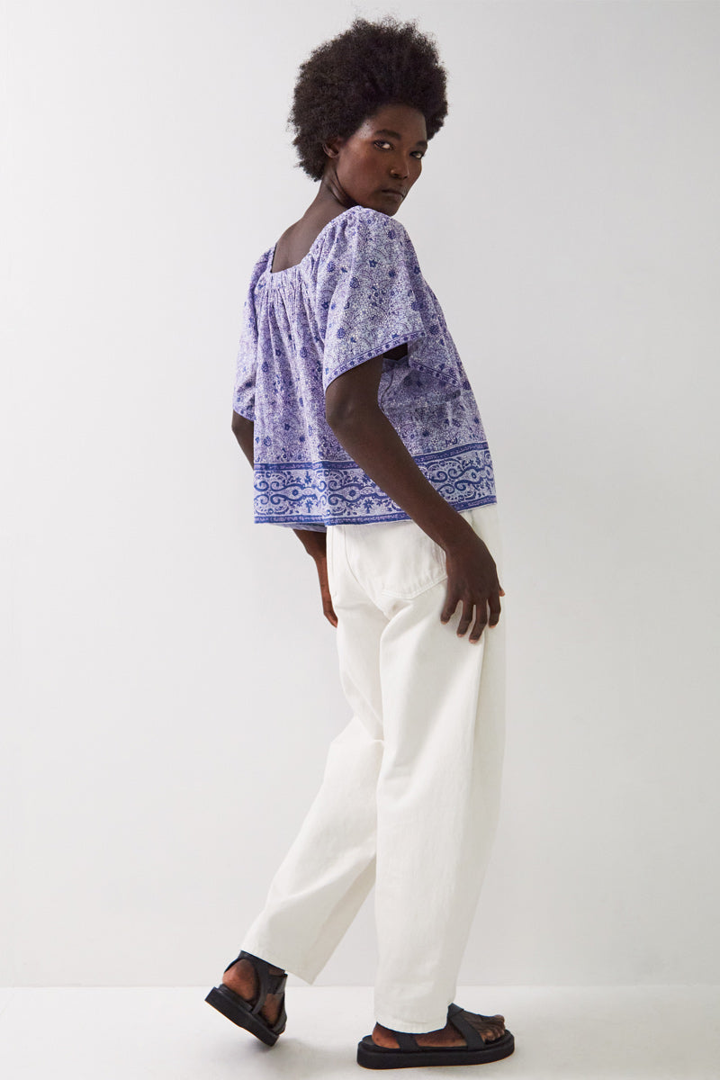 The Tiera Top is crafted from soft, cotton gauze and features an all-over print in a rich palette of blues. With a relaxed silhouette and gathered square neckline. Lightweight and airy, finished with a contrast border print.
